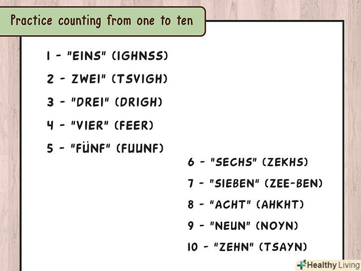 Попрактикуйтесь вимовляти голосні звуки. у німецькій мові є деякі голосні звуки, яких немає в російській мові (або, принаймні, вони не поширені). Ці звуки здаються нам складними, тому що чужі нам.[23][24]- Наприклад, в російській мові немає альтернативи звуку"ö". Це щось середнє між звуком "е", як в слові" ялинка "і звуком"о". Цей звук зустрінеться вам в німецькому варіанті числа 11.