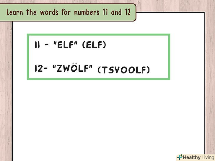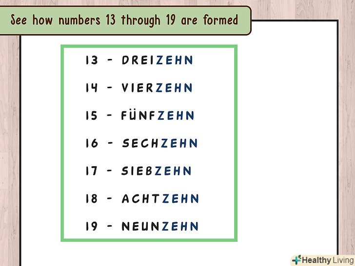 Тепер зверніть увагу на те, як формуються числа з 13 по 19. Числа з 13 до 19 формуються, як в російській мові. Хоча, насправді, в російській трохи складніше.[13][14]- У німецькій мові все, що вам потрібно зробити – додати слово "десять" (zehn), яке ви вже знаєте.