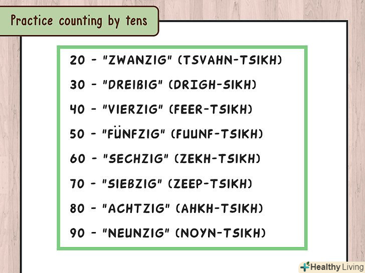 Тепер навчитеся рахувати десятками.найпростіший спосіб навчитися рахувати німецькою мовою-запам'ятати десятки– 20, 30, 40, 50, 60, 70, 80 і 90. Багато з цих чисел формується простим додаванням до числа суфікса "zig", отже, виходить:[15][16]- Двадцять- " zwanzig "(ЦВАН-цихь);