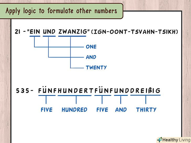 Щоб зрозуміти, як формується інше число, просто подумайте логічно.як тільки ви зрозумієте, як формуються десятки і навчитеся рахувати від одного до дев'яти, у вас будуть практично всі знання, необхідні для формування будь-якого числа німецькою мовою.[17][18]- Почніть з найменшого числа і спробуйте побудувати число. Наприклад, 21 німецькою мовою-" einundzwanzig " (АЙН-унд-цванцихь). Дослівний переклад- "один" і двадцять", а привід" und "в німецькому означає"І".