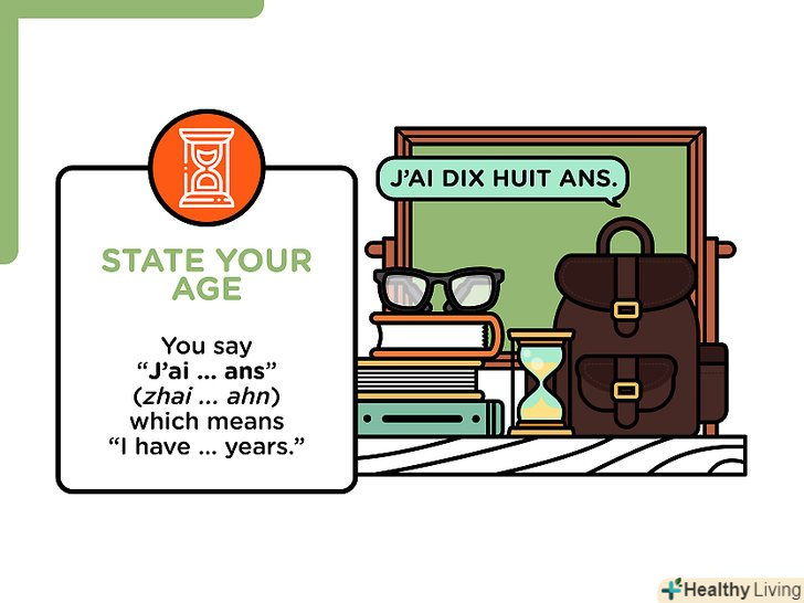 Назвіть свій вік. у російській ми говоримо" мені 15,", але в французькому ви повинні використовувати дієслово" avoir", який означає"Мати". Ви говорите " J'ai ... ans "(же... а), що означає “У мене є... ”.- Скористайтеся словником, щоб зрозуміти вимову чисел.