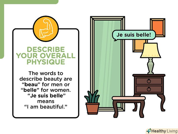 Опишіть свою фізичну форму. щоб сказати, що Ви красивий (а), використовуйте слово " beau "(боу) для чоловіків і" belle " (бель) для жінок. Використовуйте конструкцію " Je suis "(ж Суї), а потім прикметник. "Je suis belle "означає" Я красива".- "Fort" (фор) означає "Сильний", while" faible "(фебль) означає"Слабкий"