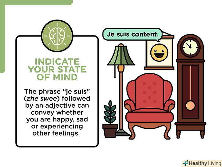 Опишіть свій настрій.Фраза "je suis" (же Суї) і прикметник за нею допоможе описати стан щастя, смутку та інших почуттів. Загляньте в словник, щоб знайти переклад і вимова слів» смуток«,» щастя«,» радість " і так далі.- Content (кун-тон) означає "Щасливий«, а triste (Тріс) означає»Сумний". Вираз "je suis triste "означає" Я сумний / мені сумно".