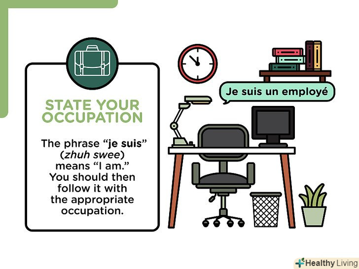 Опишіть свою професію. Фраза "je suis" (же Суї) означає "Я". Потім вам потрібно назвати професію.Пам'ятайте, що закінчення слова змінюється в залежності від того, чоловік ви чи жінка. У словнику завжди вказується відповідний суфікс.[4]- Професії, що закінчуються на" eur "для чоловіків (уе) зазвичай змінюються на "euse" (еоз) для жінок. Наприклад, масажист буде і "masseur«, і»masseuse".