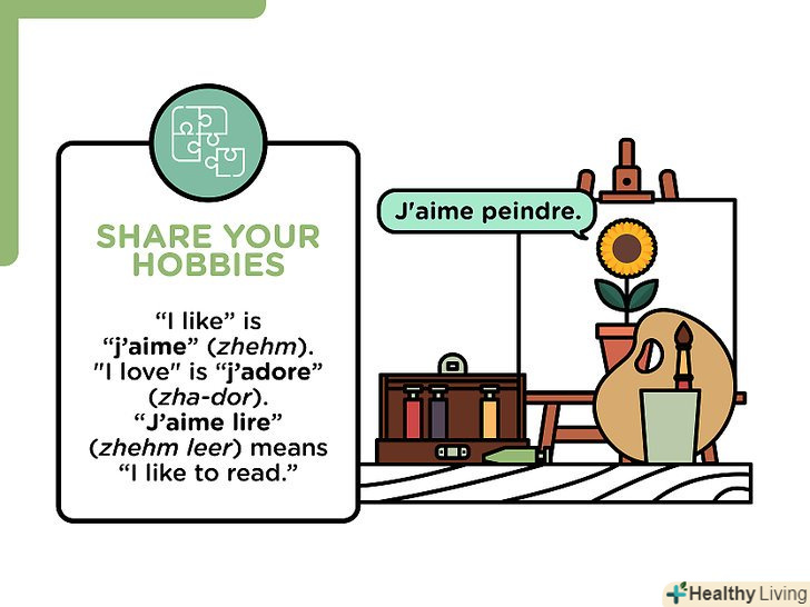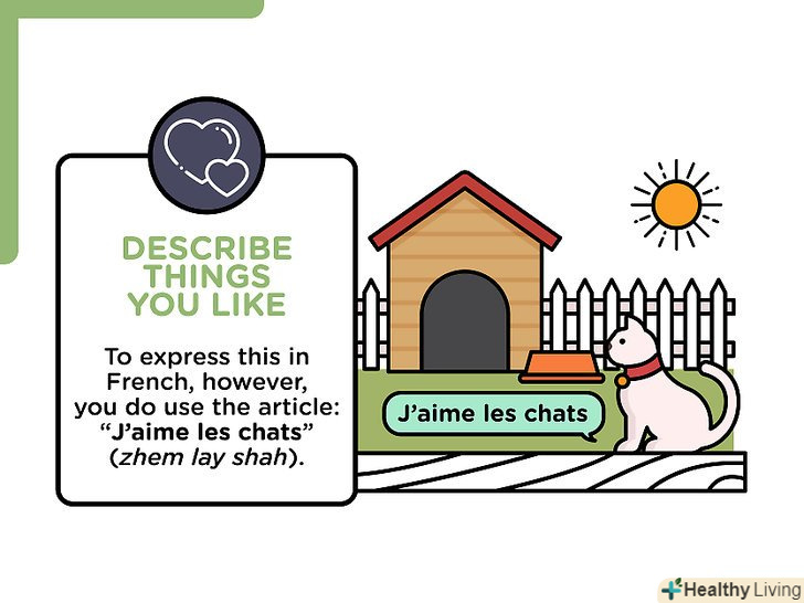 Опишіть, що Вам подобається. в англійській і російській мові не використовується артикль при описі того, що вам подобається. Ви просто скажете: "Я люблю котів". Але щоб сказати це по-французьки, вам знадобиться артикль:" J'aime les chats " (Жем ле ша).- Mon (мон) або ma (ма) використовується, коли ви хочете сказати, що любите щось, що належить вам. Mes (ме) використовується для множини.[5]