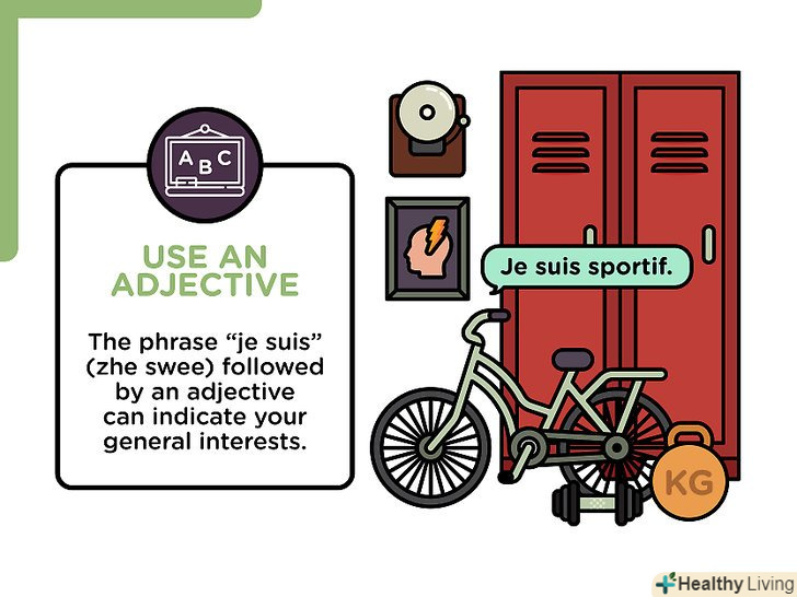 Використовуйте прикметники. Фраза "je suis" (же Суї) і наступне за ним прикметник може описати сферу ваших інтересів. Пам'ятайте, що в залежності від статі потрібно вибрати той чи інший суфікс. Зазвичай в словниках вказується спочатку суфікс для чоловічої форми, а потім для жіночої. "Je suis sportif "(спортіф) для чоловіків і" je suis sportive "(спортив) для жінок позначає " я спортивний (а)."[6]- Якщо суфікси і конструкції запам'ятати складно, можна просто сказати «j'aime les sports», є «Я люблю спорт»
