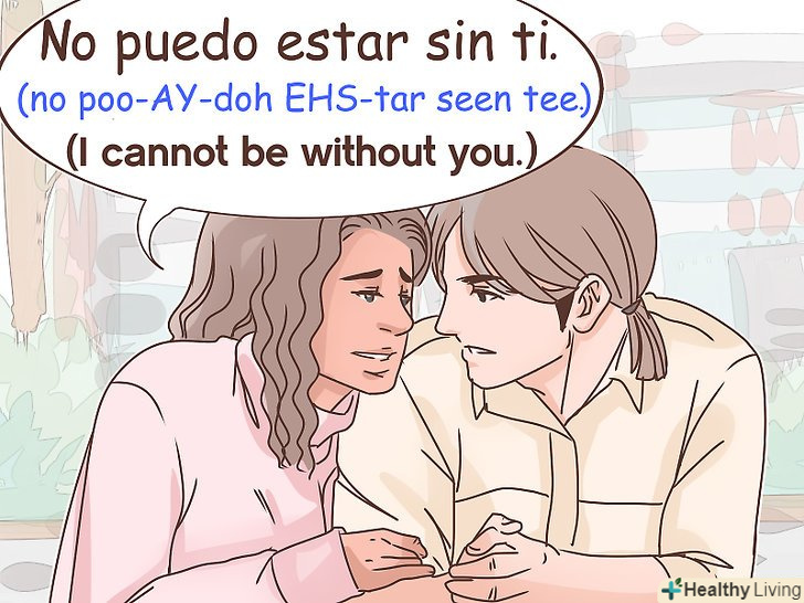 Вигукніть: "¡No puedo estar sin ti!"дана фраза може використовуватися в особливо романтичному контексті, коли ви сумуєте за людиною, життя без якого просто собі не уявляєте. Це вигук перекладається з іспанської наступним чином: "я не можу без тебе!"[18]- "Puedo "- це форма першої особи однини для дієслова" poder", який означає" могти "або"бути в змозі". Коли перед дієсловом ставиться" no", його значення змінюється на негативне, перетворюючись у фразу"Я не можу".
