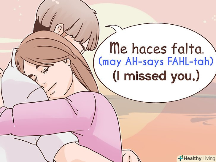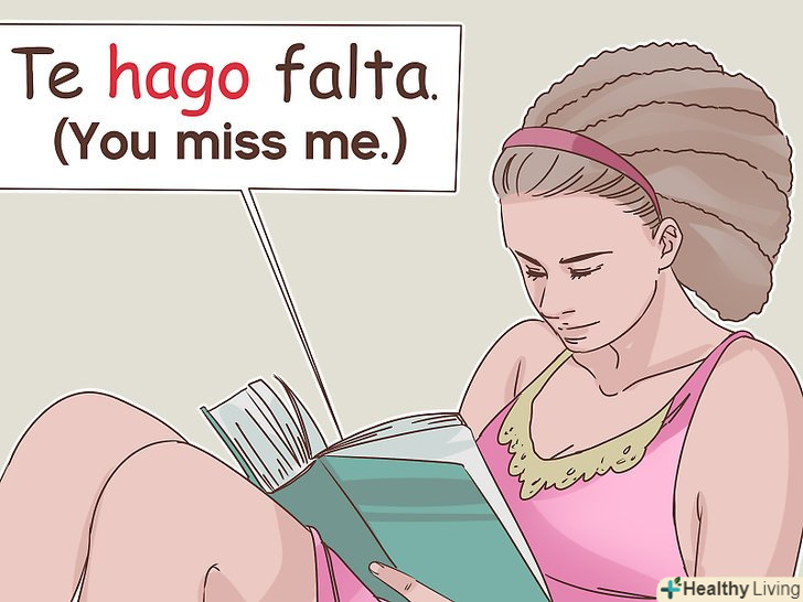 Спробуйте використовувати дієслово "hacer". коли ви говорите" я за тобою сумую "за допомогою іспанської фрази" me haces falta", ви використовуєте відповідне відмінювання дієслова hacer, який означає"Робити, створювати або заподіювати". В даному випадку форма дієслова "haces "перекладається як" ти робиш "або"ти заподіюєш".[11]- Використовувана форма дієслова повинна відповідати тій особі, за якою нудьгують, а не тому, хто сумує. Тому, якщо ви хочете скласти фразу "Ми за тобою сумуємо", форма відмінювання дієслова залишиться тією ж ("haces"), але зміниться об'єктний займенник: "Nos haces falta."[12]