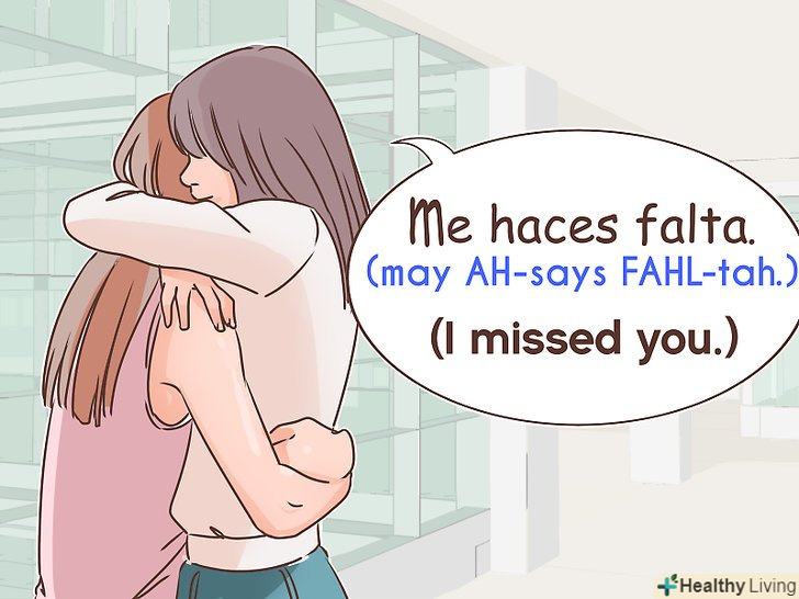 Скажіть: "Me haces falta". Це ще одна Іспанська фраза зі значенням"я за тобою сумую". Незважаючи на те, що до неї неможливо підібрати хороший дослівний переклад на російську мову, при зверненні до людини вона вказує на його провину за те, що говорить бракує цієї людини.[6]- Ця фраза складається з " me "- прямої об'єктної форми займенника для" yo "(особистого займенника першої особи однини зі значенням" я"), дієслова" haces "в значенні" ти робиш/ти заподіюєш "і іменника" falta", яке означає"брак/відсутність".