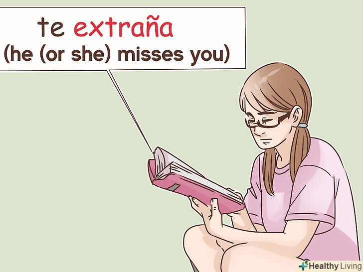 Скористайтеся дієсловом "extrañar ". коли ви говорите "te extraño", дієслово" extrañar "використовується в значенні"нудьгувати". Даний дієслово буде відмінюватися в залежності від того, хто його вимовляє і в якому часі використовує.[10]- Якщо ви хочете сказати людині, що по ньому сумує інша людина, то будете використовувати фразу "te extraña" в значенні "він (або вона) за тобою сумує". Зверніть увагу, що при цьому прямий об'єктний займенник "te" не зміниться. Людина, з яким ви будете розмовляти, все також буде об'єктом дії дієслова, а його відмінювання вкаже безпосередньо на особу, яка нудьгує.