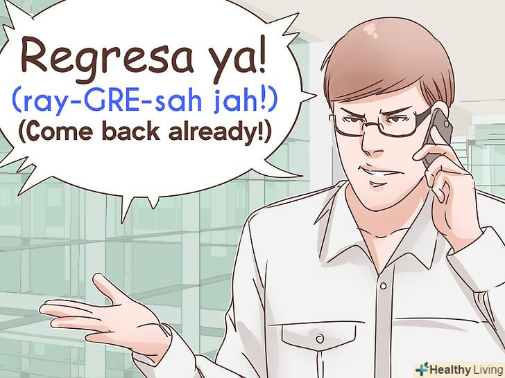 Вимагайте: "¡Regresa ya!"якщо ви вже повідомили про свою тугу, ймовірно, ви також захочете сказати людині, щоб він швидше повертався. Замість того щоб питати, коли людина повернеться, можна просто сказати йому повертатися. Фраза " ¡Regresa ya!"дослівно перекладається як" Повертайся вже!".[16]- "Regresa "- це наказова форма дієслова" regresar", який означає"Повертатися". У зазначеній фразі дієслово стоїть в наказовій формі для звернення до людини на "tú"(на "ти"). Ця форма дієслова використовується для вираження наказу.[17]