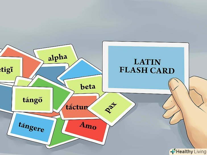 Зробіть і використовуйте картки зі словами. Це чудовий спосіб поповнити словниковий запас на будь-якій мові. Для початку придбайте пачку порожніх карток. Потім напишіть слово або фразу на латині на одній стороні, а його / її переклад на вашу мову на зворотному боці. Тепер ви можете перевірити себе. Зберігайте стопку карток з важкими для вас словами або виразами, щоб надалі ви могли заново їх переглядати і згадувати. [19]- Можливо, ви зможете знайти в інтернеті або в книжковому магазині вже готові картки на латині, проте багато фахівців рекомендують робити картки самостійно. Це пояснюється тим, що написання слів/виразів іноземною мовою допоможе вам підвищити компетентність і навчить думати на цій мові.[20]