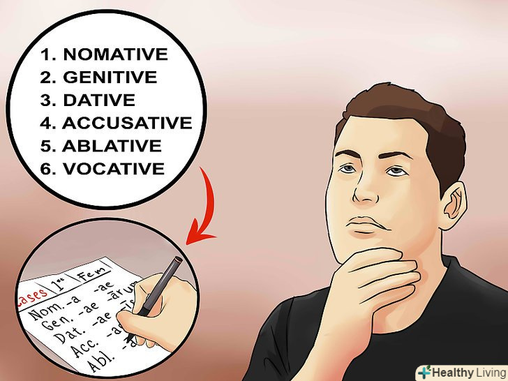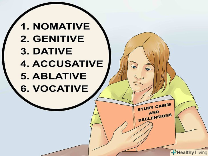 Вивчіть Латинські іменники.іменники трохи складніше, ніж дієслова, проте теж не викликають особливих труднощів. Закінчення іменників вказує на число (єдине і множинне), Стать (Чоловічий/Жіночий/середній), і відмінок (називний/родовий/давальний/знахідний/орудний/кличний).[4]