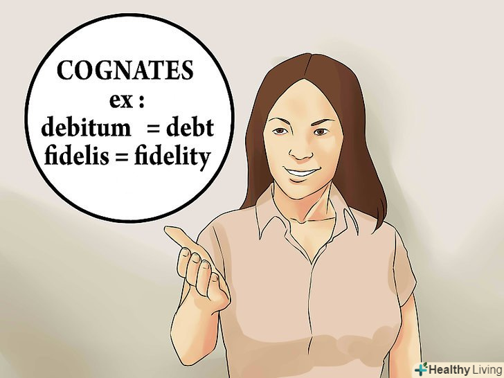 Пошукайте слова із загальним походженням. це найбільш близько пов'язані слова щодо певного слова або фрази. Якщо ви знайдете зв'язок між російськими (або англійськими, якщо знаєте мову) і латинськими словами і виразами, то зможете краще розуміти значення слова і його функції.[28]- Дуже рідко слова з загальним походженням позначають те ж, що і оригінал. Часто вони мають одне значення, але є різними частинами мови. Наприклад, латинське слово " fidelis "є прикметником, а англійське" fidelity " – іменник.
