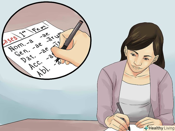 Запам'ятовуємо форми слова.багато людей, які вивчають мову, не обтяжують себе заучуванням кожної таблиці словотворення, проте в латині це необхідно, щоб повністю розуміти і використовувати мову. Найпростіший спосіб запам'ятати формоутворення-складати табличку для кожного досліджуваного слова. Потім продовжуйте виписувати кожну форму до тих пір, поки не вивчите її. На жаль, не існує більш простого методу запам'ятати щось, крім як повторювати матеріал знову і знову, поки він не відкладеться в пам'яті.[27]- Почніть з нахилів іменників і продовжуйте виписувати кожне з них, поки не зможете миттєво їх відтворювати. Потім переходите до прикметників, після – до правильних дієслів в виявному способі з активним і пасивним заставою, а також в умовній формі. Якщо ви будете це робити, в кінці кінців ви запам'ятаєте кожну форму слова, а за допомогою постійної практики вже ніколи цього не забудете.