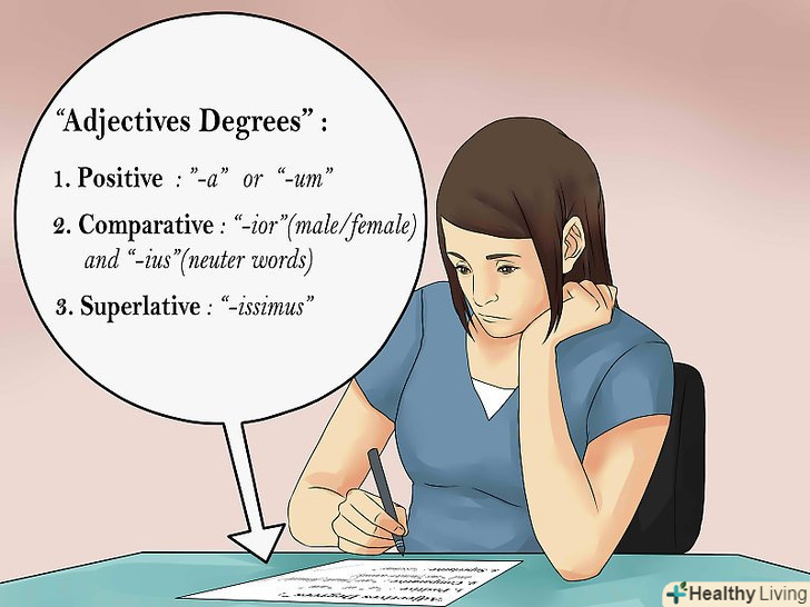Розберіться з латинськими прикметниками. В латині прикметники змінюються так само, як і іменники, зазвичай відповідно або з першим і другим схиленням (наприклад, magnus, magna і magnum – все це форми прикметника "великий") або, часом, з третім схиленням (наприклад, acer, acris і acre – все це форми прикметника "гострий").[5] прикметники в латині діляться на три ступені порівняння:- Основна (наприклад, довгий або короткий) утворюється шляхом додавання "-a" або "-um" до закінчення слова[6]