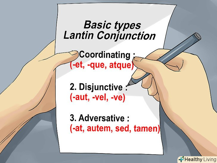 Використовуйте Латинські союзи. Так само, як і в російській мові, союзи в латині з'єднують слова, фрази, додаткові та інші пропозиції (наприклад, "і", "Але" або "якщо"). Союзи мають досить певну спрямованість, і тому не повинно виникати труднощів в їх вивченні або використанні.[8] існує три основних види спілок:- Сполучні (з'єднують слова / фрази / речення з однаковим положенням)- et, - que, atque