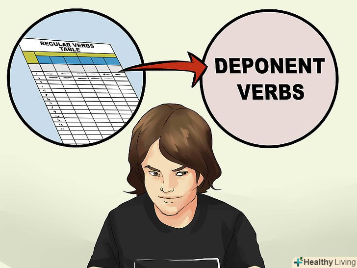 Розберіться з депонентними (відкладальними) дієсловами.Депонентні дієслова є найскладнішим поняттям при вивченні латині, тому що в російській мові вони не існують. За великим рахунком, депонентний дієслово - це дієслово, який має пасивну форму в активному значенні. Найближчим еквівалентом в російській мові можна назвати поворотні дієслова з закінченням" - ся". Так пропозиція " Юля керувала машиною "можна означати те ж, що і"Машина управляється Юлею".[15]- Форми депонентних дієслів часто збивають з пантелику учнів латині, однак, як тільки ви вивчите таблицю регулярних дієслів, у вас повинно розвинутися розуміння пасивних форм в кожному відмінюванні. Тренуйтеся і закріплюйте знання про пасивних формах відмінювань, щоб почати розбиратися, коли потрібно вживати депонентні дієслова.