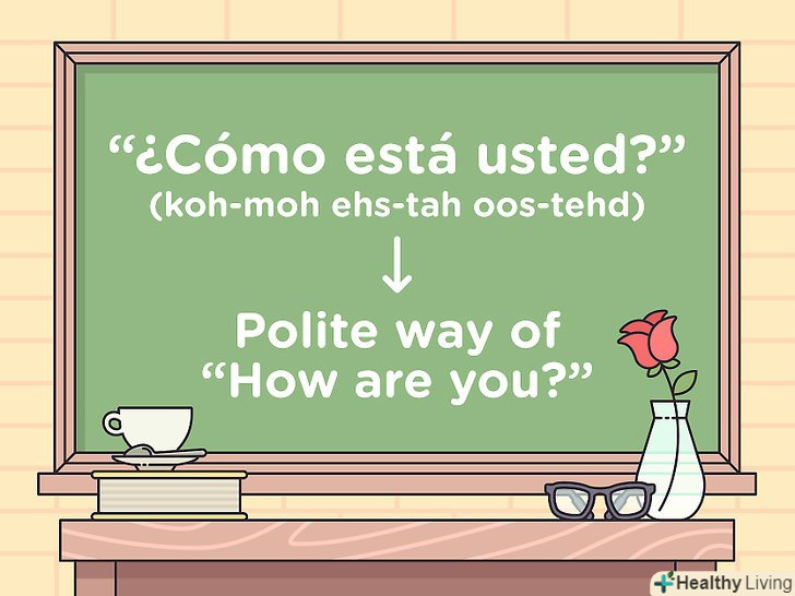 Для більш ввічливого поводження використовуйте¿Cómo está usted? (ко-мо ЕС-та ус-тед).насправді в іспанській мові немає формального способу запитати"Як справи?». Однак, ¿Cómo está usted? використовується (перш за все в Центральній Америці) при спілкуванні з людиною, яка старша за віком або яка займає керівний пост. [2]- Також не зашкодить використовувати цю фразу в розмові з незнайомою дорослою людиною, так як вона висловлює повагу.