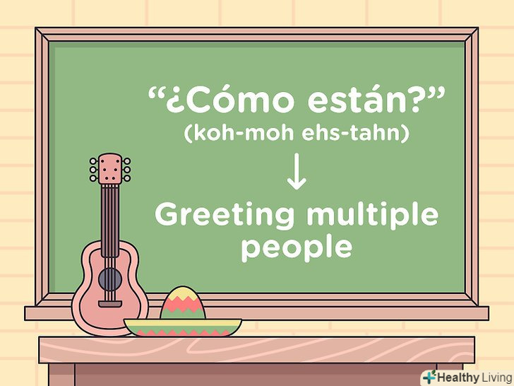 Запитайте¿Cómo están? (ко-мо ЕС-тан), якщо вітаєте групу людей.якщо ви підійдете до компанії людей і захочете привітати всіх разом, можна сказати ¿Cómo están?. Дієслово estan співвідноситься з» ви "у множині, що еквівалентно питанню"як ви все поживаєте?"російською мовою. [3]- Щоб надати питання неформальний відтінок, скажіть¿Cómo estais? (ко-мо ЕС-тайс).