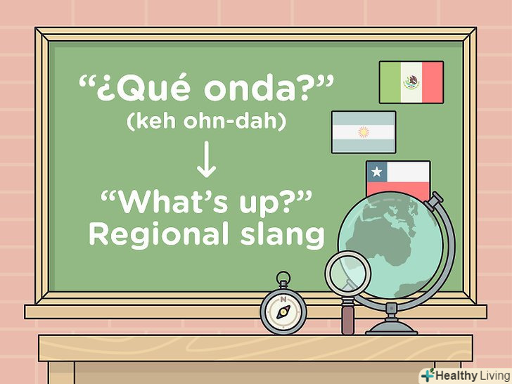 Експериментуйте з регіональним діалектом у повсякденних ситуаціях. у різних іспаномовних країнах є свої фрази, які служать альтернативою ¿Cómo estás?. Регіональний або місцевий діалект може зробити вашу мову більш природною. Так як ці вирази є сленговими, то їх краще використовувати тільки при взаємодії з ровесниками. Ось кілька прикладів: [5]- ¿Qué onda? (ке он-да): Мексика, Гватемала, Нікарагуа, Уругвай, Аргентина, Чилі