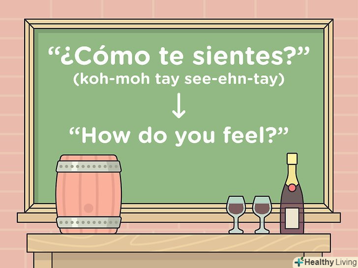 Використовуйте¿Cómo te sientes? (ко-мо те сьен-ТЕС), щоб впоратися про самопочуття людини. ¿Cómo te sientes? ви буквально запитуєте співрозмовника, як він себе почуває. Це питання, як правило, більш доречний, якщо ви знаєте, що людині останнім часом нездоровилося. Зазвичай ця фраза не використовується як пряма альтернатива ¿Cómo estás?.[6]- Якщо ви не знайомі з людиною, краще запитати¿Cómo se siente? (ко-мо се сьен-те). Це більш формальний варіант того ж питання.