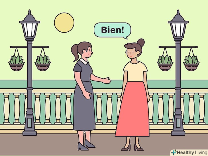 У більшості ситуацій відповідайтеbien (б'єн).як правило, в іспанській культурі питання " Як справи?"не сприймається буквально. Найпоширенішою відповіддю є bien (б'єн), що означає «Добре» або «прекрасно».[7]- Після словаbien (б'єн) завжди додавайте gracias (гра-Сі-ас), що означає «Спасибі».