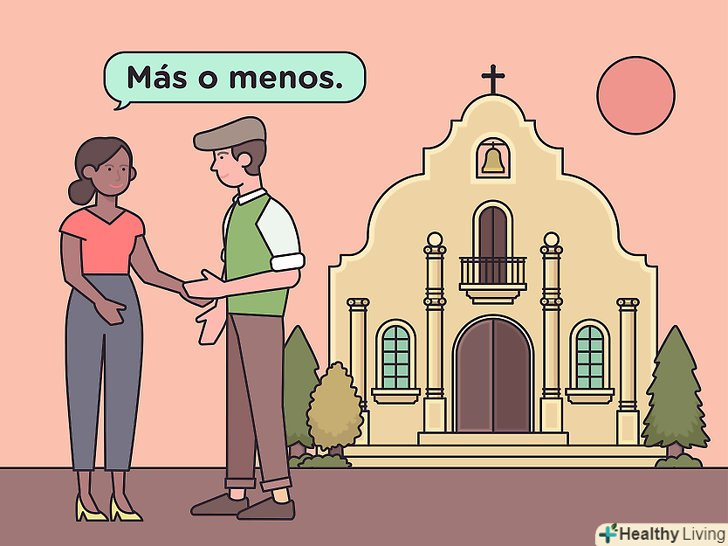 Перейдіть на más o menos (мас о ме-ніс), якщо ви не в дусі. якщо у вас був важкий день і ви не відчуваєте себе так вже bien, але не хочете говорити про це (що було б ніяково), можна використовувати más o menos (мас про ме-ніс), що буквально означає «плюс-мінус». По-російськи приблизний відповідь звучав би як «піде» або «так собі».[8]- Можна також сказатиasí así (Асі Асі), що фактично означає Те ж саме.