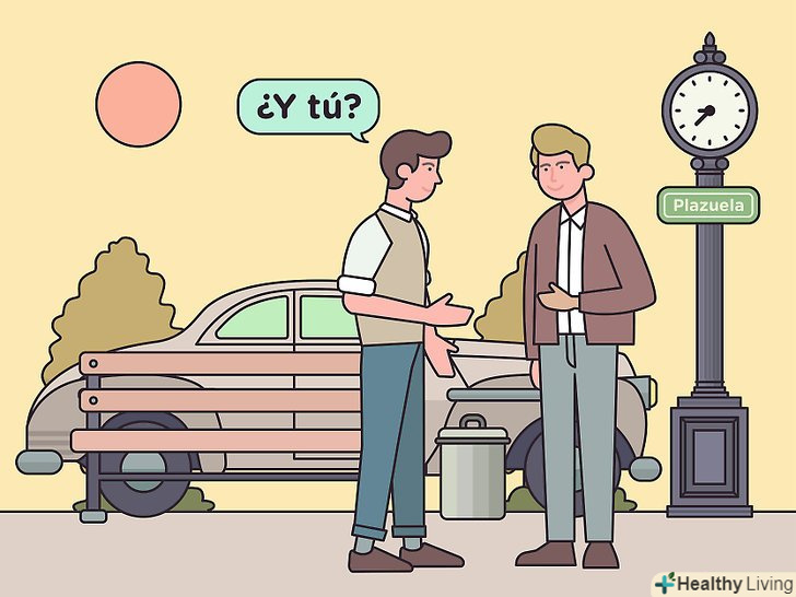 У відповідь запитайте¿Y tú?. якщо спочатку задали питання вам, то буде ввічливо запитати ¿Y tu? після відповіді співрозмовнику. Це буквально означає: "А у тебе?"[9]- Структура розмови схожа на те, як ми спілкуємося російською мовою. Одна людина вітається і запитує, як поживає співрозмовник. Той, як правило, відповідає: "добре, а у тебе?"Дотримуйтесь тих же шаблонів спілкування і в іспанській мові.