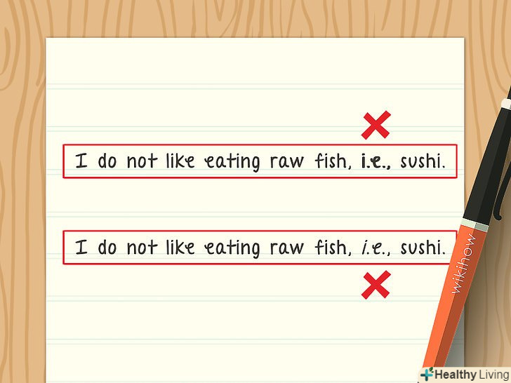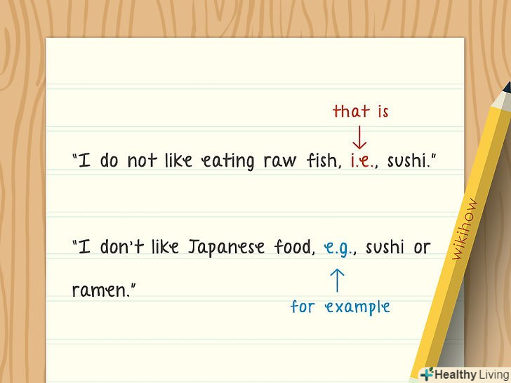 Не використовуйте абревіатуруi.e., щоб сказатиfor example (наприклад) або such as (такий як). Не ставте i. e., якщо хочете надати читачеві приклад або ілюстрацію того, що Ви маєте на увазі. В такому випадку потрібно ставити E.g.замість i.e.. E. g з латинської означає for the sake of example (як приклад).[3]- Наприклад, можна написати: I do not like eating raw fish, i.e., sushi (мені не подобається сира риба, іншими словами, суші), — і: I don't like Japanese food, e.g., sushi or ramen (мені не подобається японська їжа, наприклад, суші або рамен).