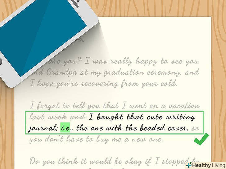 Абревіатураi. e.означає латинську фразу id est, що перекладається як in other words(іншими словами) або that is to say (інакше кажучи).[1] можливо, ви не знаєте, як використовувати i. e., коли пишете твір у школі або короткий виклад бізнес-пропозиції. Для початку подумайте, чи буде абревіатураi.e. корисною в реченні. Потім поставте i. e. в речення, правильно розставивши коми, щоб воно було граматично вірним. За допомогою декількох простих кроків ви в одну мить зможете використовувати абревіатуру i. e. як професіонал.