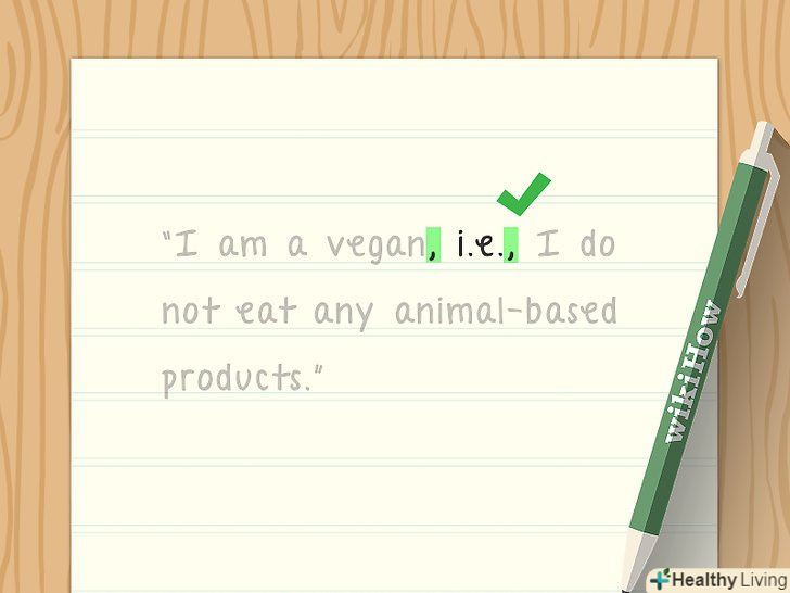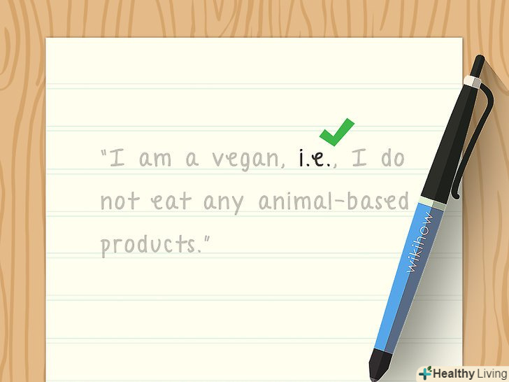 Використовуйте i. e., щоб сказати that is (тобто) або in other words (іншими словами). Використовуйте абревіатуру i. e., коли хочете додати щось до першої частини речення і надати читачеві додаткову інформацію. Ця інформація повинна пояснити першу частину пропозиції більш детально, щоб читач краще її розумів.[2]- Наприклад, можна написати:I am a vegan, i.e., I do not eat any animal-based products (я веган, тобто не вживаю в їжу продукцію тваринного походження), — або: He works the morning shift, i.e., from 6 am to 1 pm (він працює в ранкову зміну, тобто з 6 ранку до години дня).