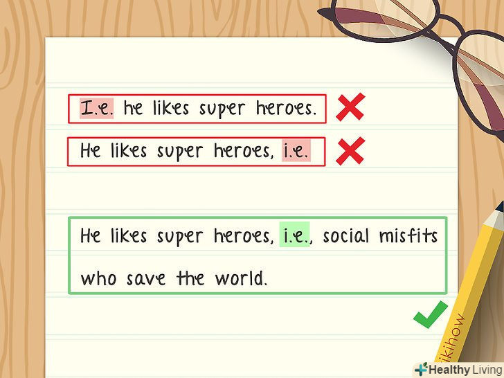 Ставте абревіатуруi.e.В середині речення і ніколи не використовуйте її на початку або кінці. Щоб речення було граматично правильним, абревіатуру i. e. потрібно завжди використовувати в середині, після першої частини.[8]- Наприклад, пропозиціяI. e. he likes super heroes (тобто він любить супергероїв) або пропозицію He likes super heroes, i.e. (Він любить супергероїв тобто) — некоректні. Правильно буде написати: He likes super heroes, i.e., social misfits who save the world (Він любить супергероїв, тобто ізгоїв суспільства, які рятують світ).