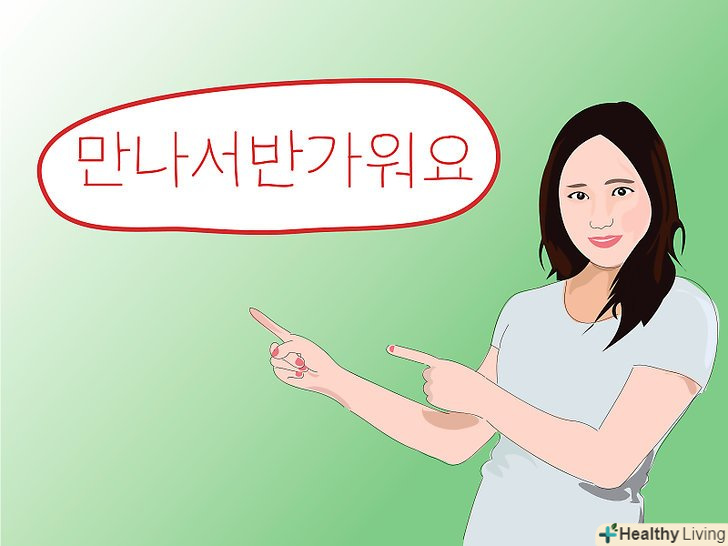 Завершіть привітання фразою 만나서반가워요. вимовляєте 만나서반가워요 як "Ман-на-со-пан-гауо-Йо". Фраза означає"Приємно познайомитися".