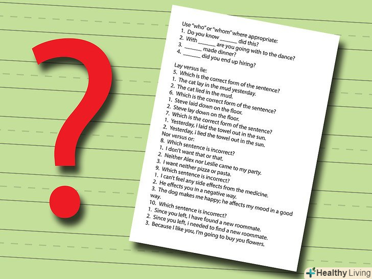 Тренуйтеся, тренуйтеся, тренуйтеся!попросіть свого вчителя англійської мови або друга сказати вголос кілька речень, де є одне з цих трьох слів, і записуйте версії, які він використовував. Пошукайте граматичні тести в Інтернеті.[3] найміть репетитора з англійської мови, якщо у вас все ще є проблеми.