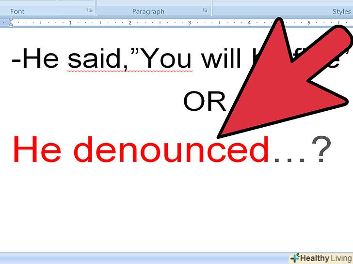Не обмежуйтеся тільки «він сказав "або»вона сказала".використовуйте різноманітні фрази, наприклад:" він пробурчав "або"він засудив". Однак такі фрази можуть відвернути увагу від того, що говорять ваші персонажі. Часте використання фраз "він сказав" І "вона сказала", як правило, стають практично невидимими для читача. [8]