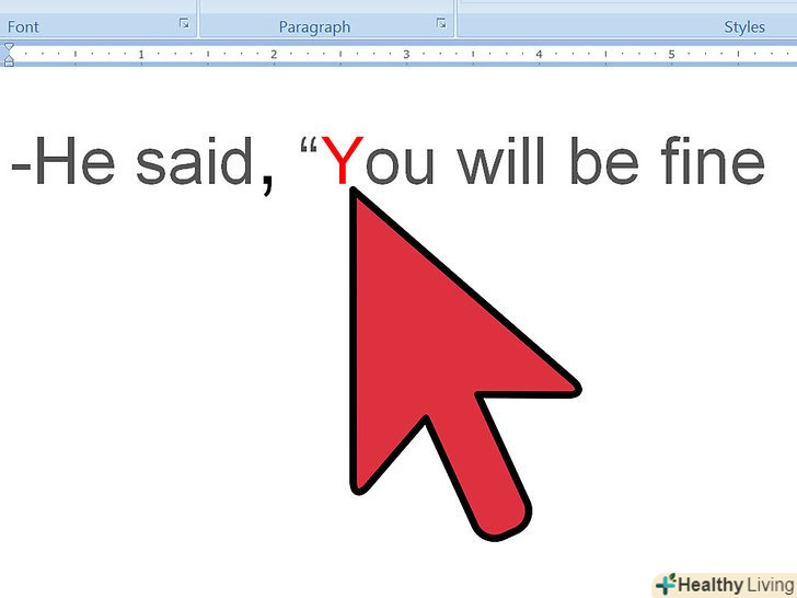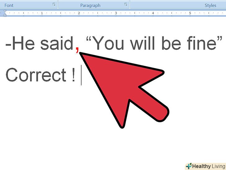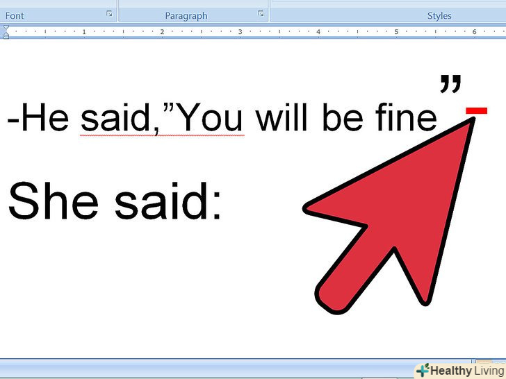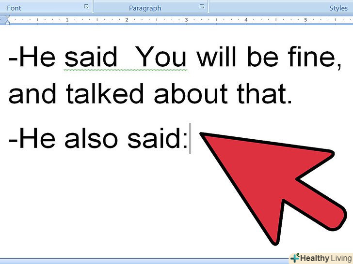 Використовуйте лапки правильно.багато письменників виділяють лапками слова персонажа, який їх вимовляє, наприклад: Бет йшла по вулиці і побачила свою подругу Шао. "Привіт!"- сказала вона і помахала рукою. [3]- Текст, виділений лапками, може складатися з декількох пропозицій, в разі, якщо мовець висловлює думки одну за одною. Наприклад: Євген заявив: "але Лаура не доїла. Ви завжди балуєте її чимось смачненьким!"