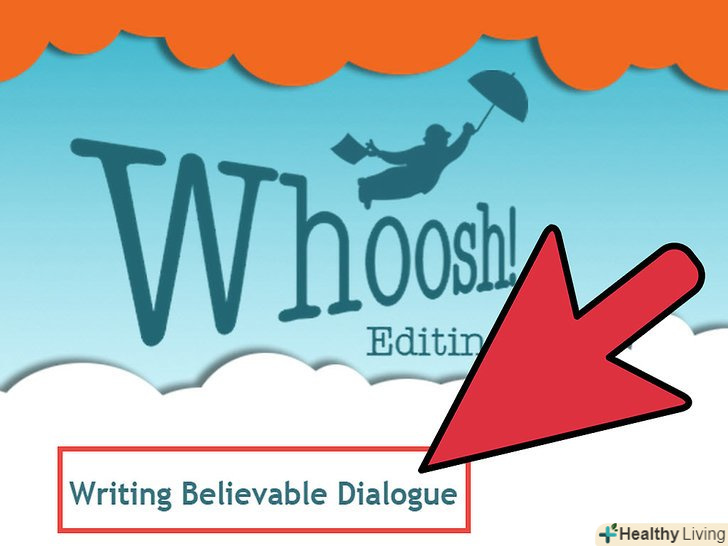 Використовуйте правдоподібну мову.найбільша проблема діалогів полягає в тому, що дуже часто вони звучать неправдоподібно. Подумайте про те, як ви спілкуєтеся в повсякденному житті! Подумайте про те, що відчуває ваш персонаж і що він хоче сказати вам. Вимовте це вголос, використовуючи звичайні слова. Немає необхідності використовувати високопарні слова, які ми рідко використовуємо в повсякденній мові; Говоріть так, як Ви розмовляєте в повсякденному житті. Прочитайте діалог, і спробуйте об'єктивно оцінити його. [14]