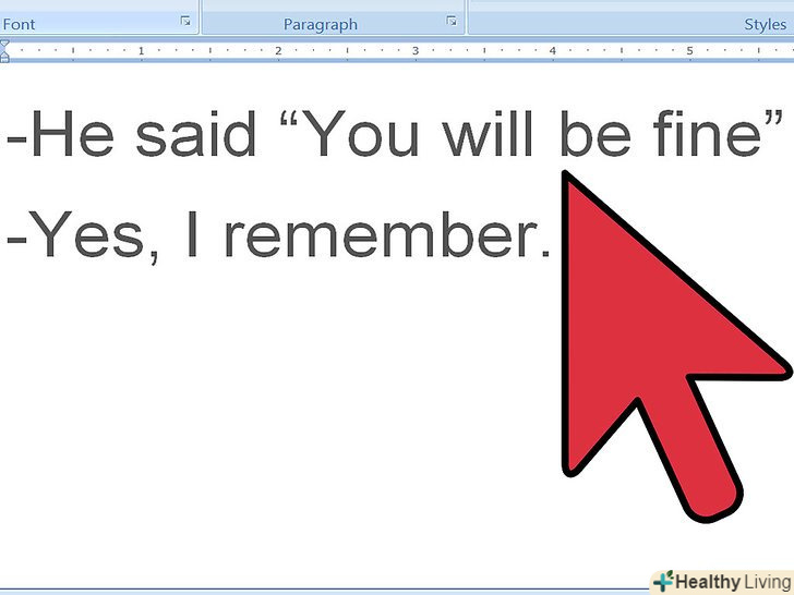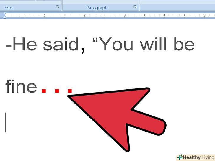 Використовуйте тире правильно.Тире використовується при оформленні діалогів на листі. Не плутайте тире з дефісом. Дефіс-орфографічний знак, який ставиться між частинами одного слова. Три крапки (...) використовується, коли мовець затихає, не договоривши.- Наприклад, використовуйте три крапки, щоб показати, що думка не закінчена: "що y ...? "- почав Джо.