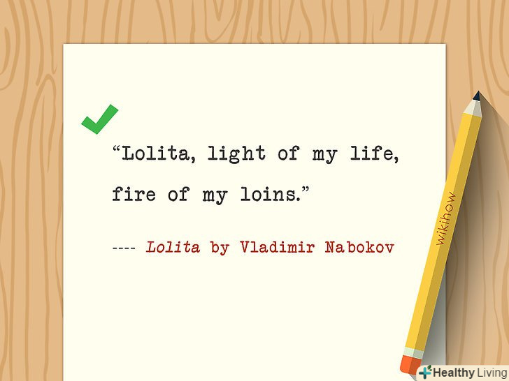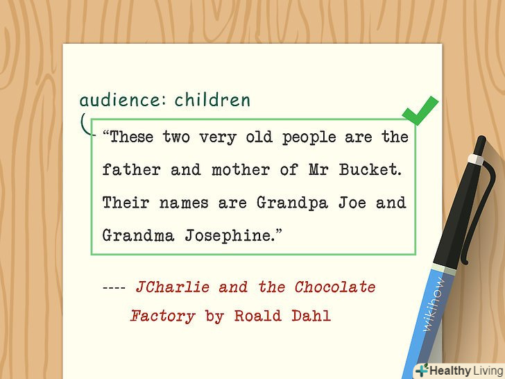 Задайте оповіданню захоплюючий тон.ви також можете започаткувати свою книгу за допомогою унікального та переконливого наративного тону оповідача. Це особливо ефективно, коли розповідь ведеться від першої особи « "голос" оповідача допоможе подіям книги розвиватися. Розповідь від третьої особи допоможе вам представити героїв у вигідному світлі.[7][8]- Наприклад, так починається " Гаррі Поттер і філософський камінь» Дж. К. Роулінг: "Містер і місіс Дурсль проживали в будинку номер чотири по тисовій вулиці і завжди з гордістю заявляли, що вони, слава богу, абсолютно нормальні люди».[9] розповідь ведеться від третьої особи зі своєю позицією і колоритом, що більше притягує читача.