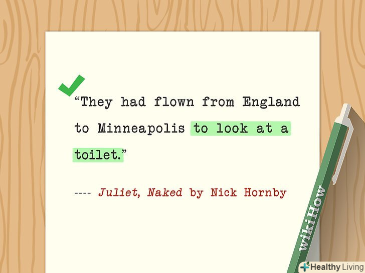 Використовуйте незвичайну обстановку.ви можете залучити читацьку аудиторію, створивши виняткову і дивну ситуацію для своїх персонажів. Це може спонукати людину Продовжити читання, щоб дізнатися, як герої вийшли з незвичайного становища.[11][12]- Нік Хорнбі свій роман "Гола Джулієтта «починає з фрази:»Вони летіли з Англії в Міннеаполіс, щоб подивитися на сортир".[13] ця нетипова і дивовижна картина відразу ж привертає увагу читача.