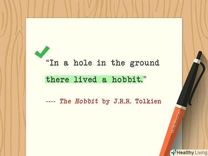 - Ви також можете приступити до книги з опису місця дії. Відмінним прикладом тут послужить» Хоббіт " Дж. Р. Р. Толкіна:»Жив-був у норі під землею Хоббіт".[4] Автор починає з опису місця і головного хоббіта, тим самим приковуючи увагу людини до твору.