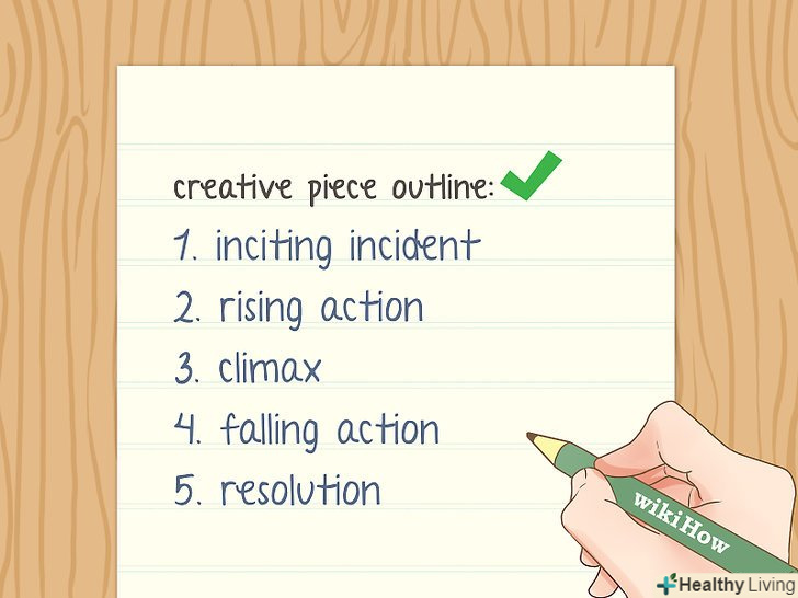 Придумайте конфлікт, кульмінацію і розв'язку для художнього тексту.художні твори бувають дуже різними, але сюжет завжди повинен мати зав'язку, конфлікт, кульмінацію і розв'язку (саме в такому порядку). Спочатку уявіть головного героя і місце дії, щоб читач занурився в сюжет. Потім введіть в текст людини, предмет, подія, які змінять звичні підвалини світу твору. Зміни повинні досягти межі або кульмінації, після чого настає логічна розв'язка.[11]- Розв'язка-це не завжди щасливий кінець. Найголовніше-звести всі сюжетні лінії в одну точку, щоб події знайшли сенс.
