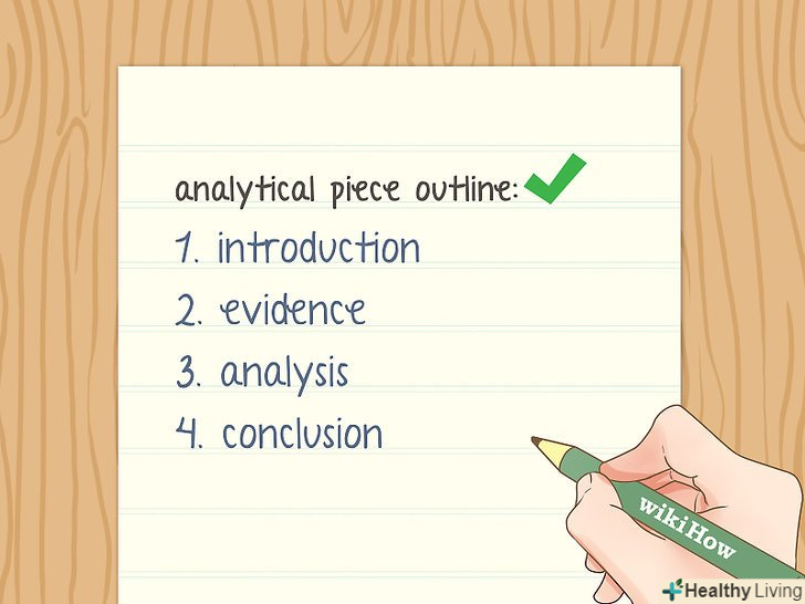 Аналітичний текст повинен містити введення, факти, аналіз і висновок. організація тексту залежить від характеру завдання і прийнятих стандартів. Проте, в сухому залишку аналітичний текст повинен починатися зі знайомства з темою і аргументацією, після чого переходити до підтверджуючих даних, аналізу або тлумачення автора, а в самому кінці містити заключну частину.[12]- Якщо ви проводили власне дослідження або збирали дані, то важливо розглянути методи дослідження до викладу даних.