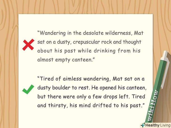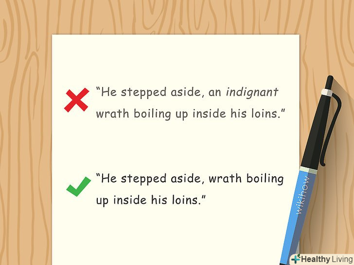 Позбудьтеся від непотрібних слів.якщо слово не має особливої важливості для побудови сюжету або семантики речення, то його можна опустити. Краще написати короткий і лаконічний, а не надлишковий текст. При надлишку слів матеріал буде здаватися перевантаженим, пихатим або нечитабельним. Зверніть увагу на наступне:- Прикметники. Прикметники описують іменники і найбільш ефективні з тому випадку, коли використовуються вибірково і навмисно. Розгляньте пропозицію: "тоді відійшов убік, задихаючись від обуреного обурення" . "Обурений "означає гнівний, але такий же сенс несе слово"обурення". Краще написати: "тоді від відійшов убік, задихаючись від обурення" .