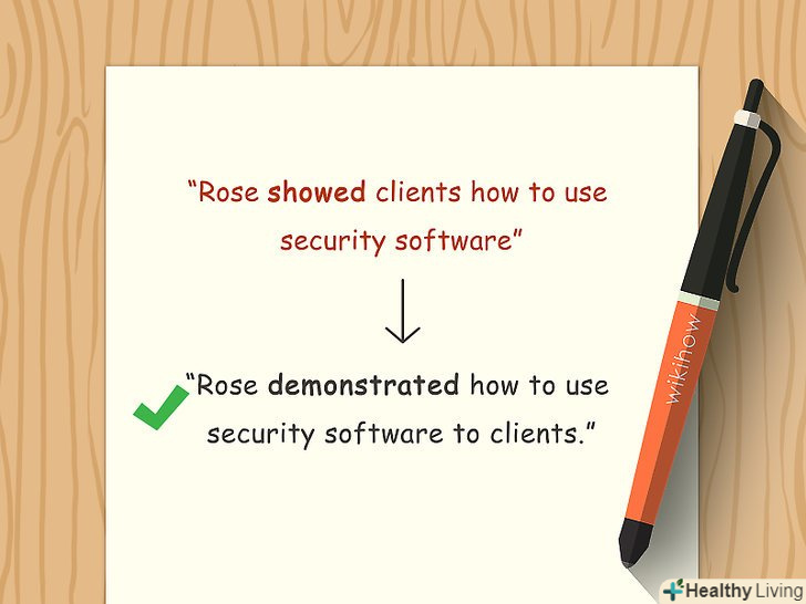 Надавайте фразам стрімкості за допомогою дієслів.доречний дієслово поліпшить фразу і замінить собою зайві прикметники. Намагайтеся завжди будувати речення на основі відповідних дієслів.[21]- Розгляньте такий приклад: "він непомітно зайшов в кімнату". Це звичайна, але надмірна і прісна пропозиція. Щоб поліпшити його і висловитися більш конкретно, можна використовувати дієслово "заповз", "пробрався" або "прослизнув " замість"непомітно зайшов".
