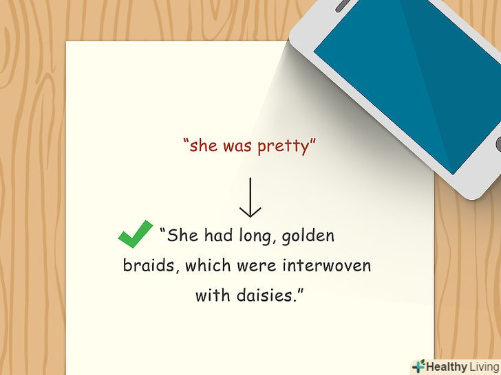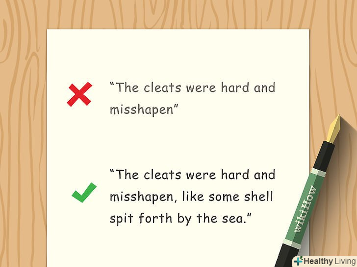 Використовуйте образну мову в художніх творах. фігури мови включають порівняння, метафори, персоніфікацію, гіперболу, алюзію та ідіоми. Розважливе використання таких прийомів підсилює текст. Пропозиція "Бутси виявилися безформними і жорсткими" можна поліпшити за допомогою порівняння: "Бутси виявилися безформними і жорсткими, як черепашки на морському узбережжі" .[23]- Багато хто часто використовують порівняння і метафори, але спробуйте розбавляти їх іншими стежками і фігурами мови, щоб надати тексту глибину і фактуру. Наприклад, гіпербола відразу кинеться в очі читачеві і справить належний ефект.