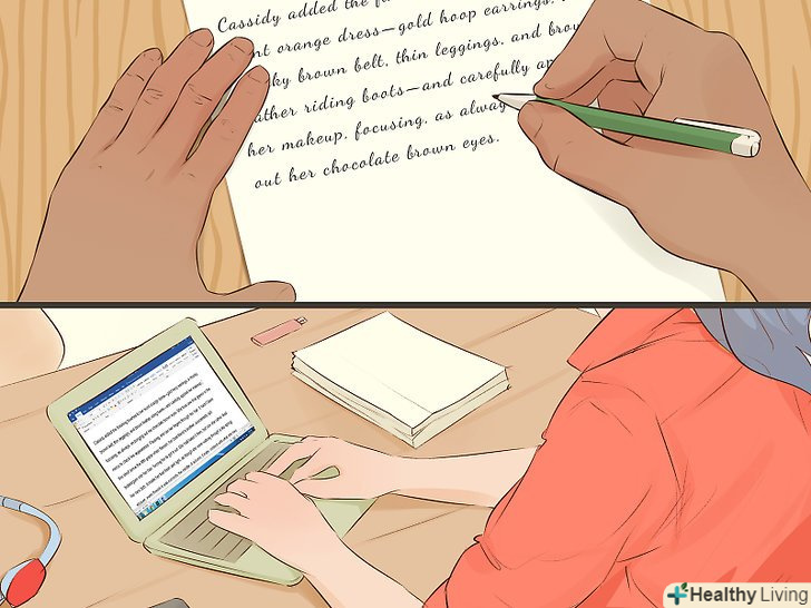 Напишіть чернетку.записуйте все, що ви хочете включити в роботу. Кількість помилок і неточних прикметників в даний момент не має особливого значення. Пізніше у вас буде час, щоб внести зміни і привести текст в порядок, тому зосередьтеся на тому, щоб викласти всі свої ідеї.[13]- Можна написати чернетку всього тексту або працювати поетапно. Другий варіант більш зручний для роботи над об'ємними творами.