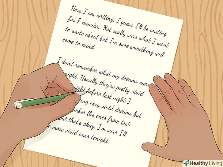 ВикористовуйтеВільний лист, щоб розвивати свої ідеї.так, можна встановити таймер і безперервно писати відведений час. Зараз не час замислюватися над помилками, якщо думки ллються вільним потоком. Не важливо, чи будете ви використовувати цей текст в майбутньому. Важливо позбутися творчої кризи і підтримувати письменницькі м'язи в тонусі. Навіть нісенітниця буде хорошим початком![5]- Метод вільного письма підходити практично для будь-якого стилю. Почніть писати розповідь, записуйте свої думки і спостереження, викладіть все, що вам відомо про предмет. Дозвольте словам безперешкодно лягати на папір.