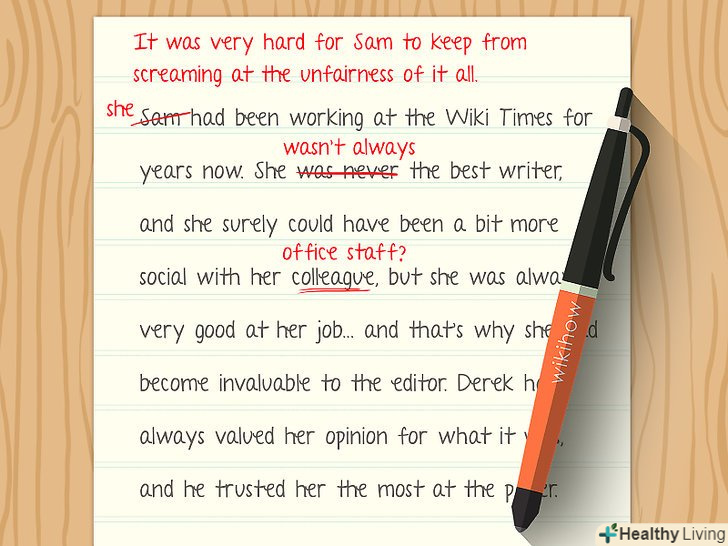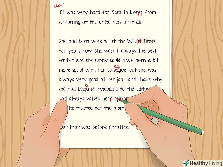 Відредагуйте Текст.Перечитайте свій чорновий варіант і почніть вносити зміни. Надайте бажану форму сюжету або доводам і зосередьтеся на створенні чітких переходів між пунктами або тезами. Також подумайте про те, що в тексті зайве.[14]- Перевірте зв'язність тексту. Всі частини текст об'єднані загальним змістом? При позитивній відповіді продовжуйте роботу. При негативному-змініть або видаліть невідповідні уривки.